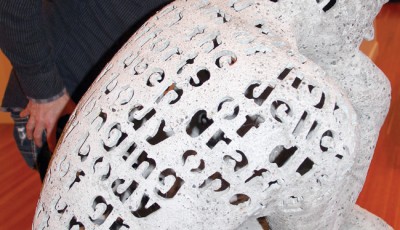 Inspired by the intriguing sculptures by artist Phil Morrison on display at Two Rivers Gallery until Oct. 12, Michael Armstrong of Victoria, stands by Morrison’s sculpture Desire and Discipline. He and other poets came together Thursday evening to share their written verse in a special event called 3-D Poetry. Teresa MALLAM/Free Press