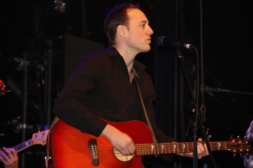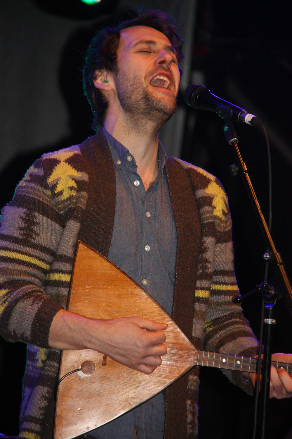 Adrian Glynn of Vancouver indie folk band The Fugitives, plays the balalaika, a Russian instrument that produces a sound similar to a mandolin. On the BCLC stage Monday night, Glynn told the Canada Games Plaza crowd that the instrument belonged to his Baba and it is over 100 years old. Teresa MALLAM/Free Press